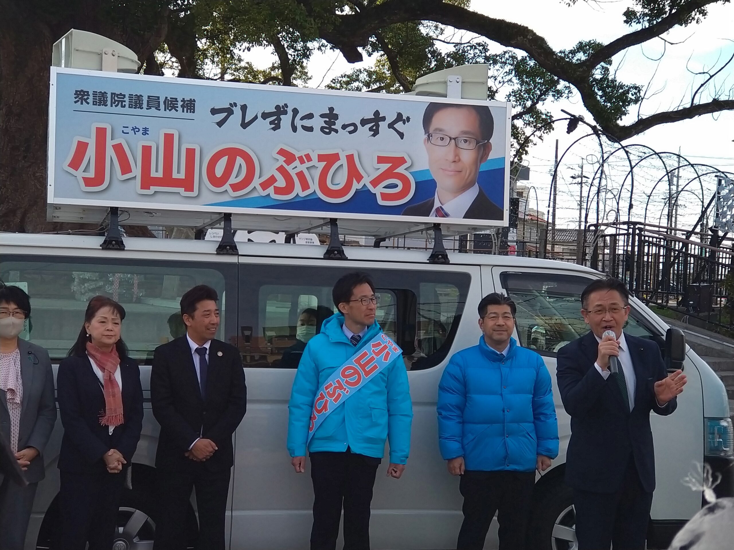 小山のぶひろ候補の街頭演説を各地で行っています。今日の午後には磐田駅前クスノキ広場で多くの聴衆の方々にお集まりいただき演説会を開催しました。
